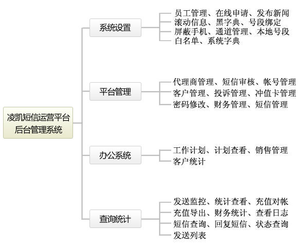 平台管理:代理商管理、短信审核、帐号管理、投诉管理、充值卡管理、密码修改、财务管理、短信管理。